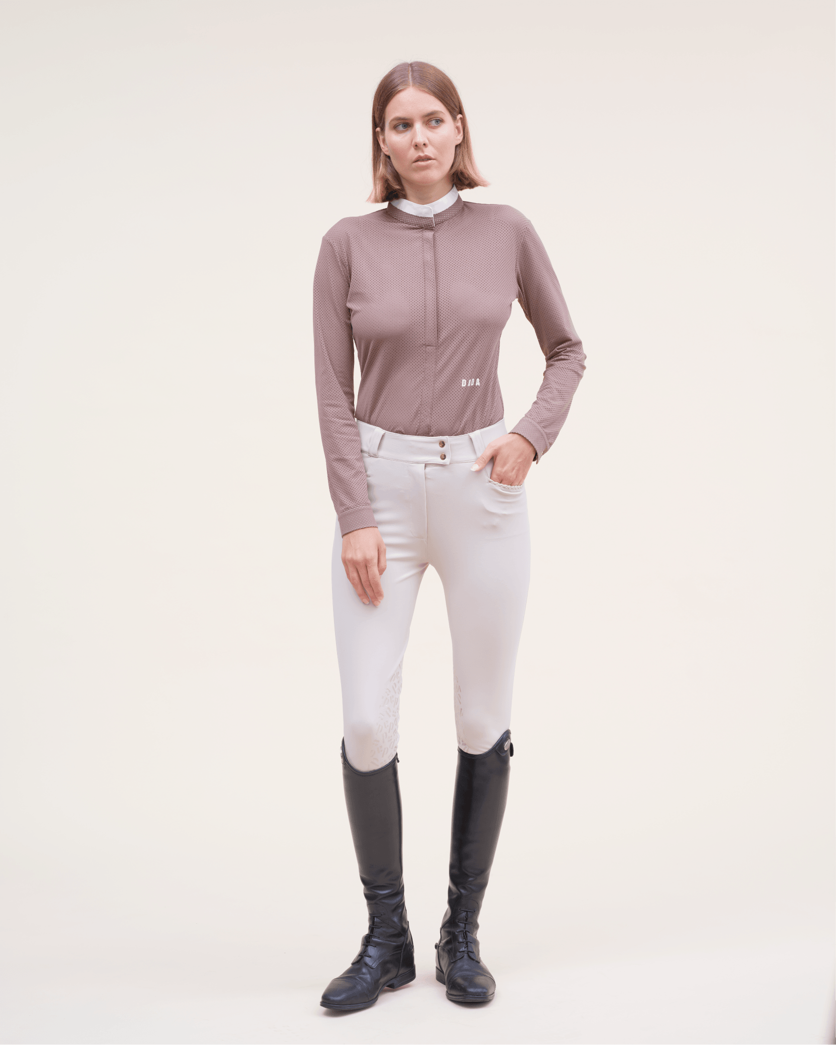 - Pantalon d’équitation taille haute, conçu pour garantir un maintien optimal tout en offrant une silhouette élégante.