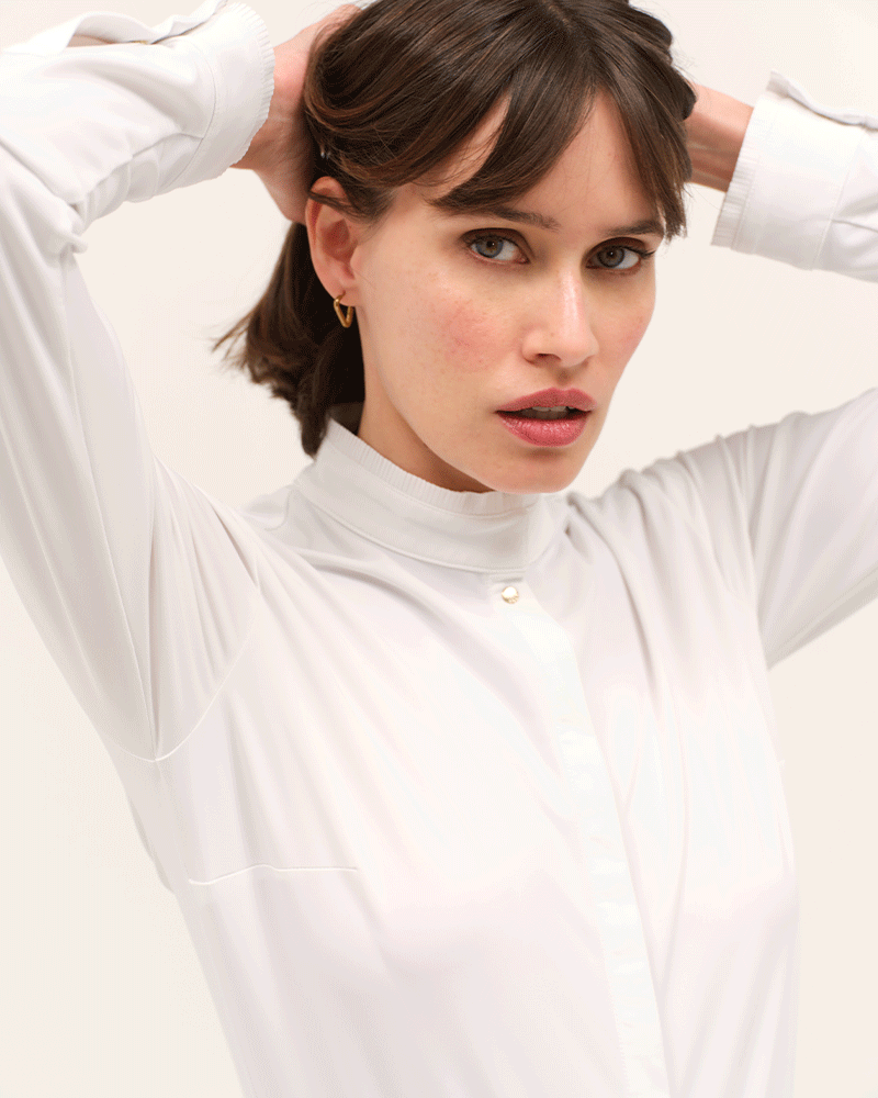 - Fermeture discrète : boutons invisibles sur le devant avec pressions dorées sur les manchettes.